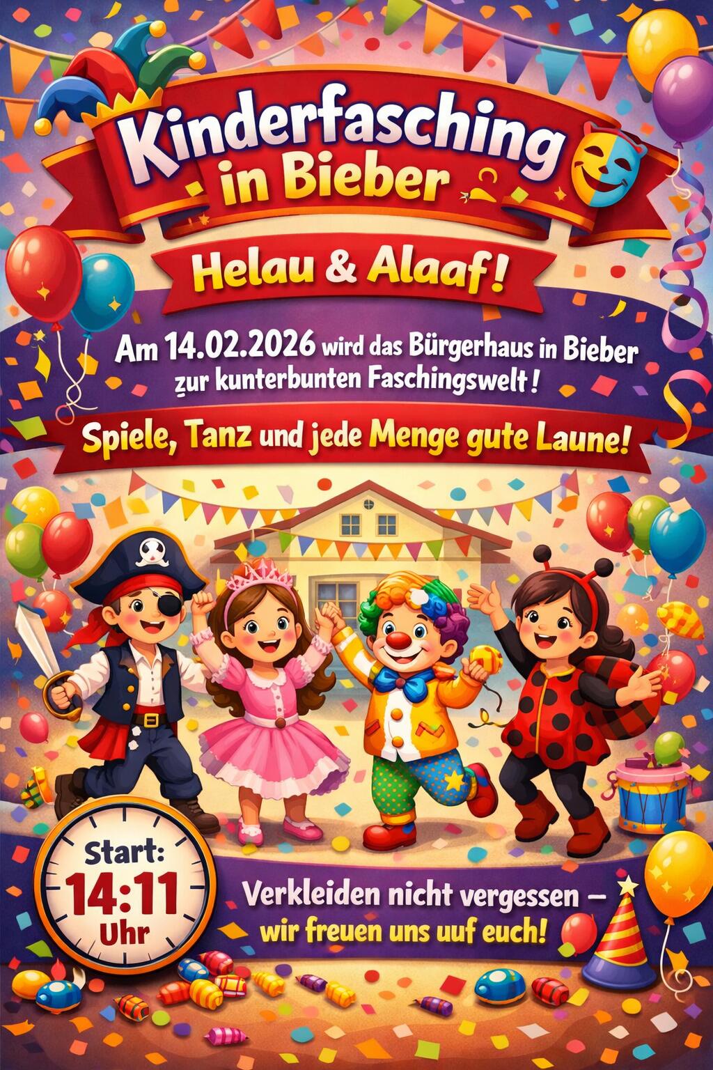 Am 14.02.2026 wird das Bürgerhaus in Bieber zur kunterbunten Faschingswelt!